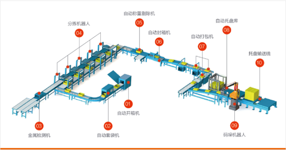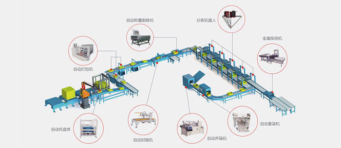 箱类机器人码垛解决方案由开箱机、套袋机、金属探测机、装箱机(分拣机器人)、封箱机、自动称重剔除机、打包机、各类输送机、红杏黄片成人视频、自动托盘库、托盘输送机组成。