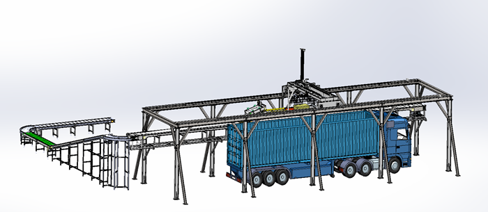 自动桁架式装车机是一种建立在直角X,Y,Z三坐标系统基础上,对袋料进行工位调整,或实现袋料的轨迹运动等功能的全自动工业设备。它的主要功能代替人工装车操作,自动将物品逐层、逐垛地码放至车厢内,物品可按照要求自动编组。大大地节省了人力降低了成本,可对各种包装进行全自动装车作业。 自动桁架式装车机应用范围广泛,适用于各种规格的敞篷货车,可适用于粮油、建材、饲料、化工、食品等行业的袋装货物和箱装货物的装车和码垛。