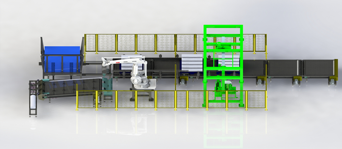 袋类机器人码垛解决方案由定量包装、倒袋装置、各类输送机、振打整形装置、待码平台、红杏黄片成人视频、自动托盘库和托盘输送线组成。